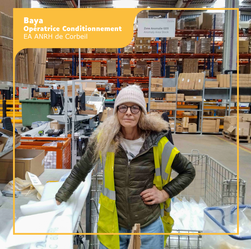 « Actuellement, je travaille chez un client de l’entreprise adaptée de Corbeil, plus précisément sur le site Kuehne+Nagel à Lieusaint, un grand entrepôt logistique de conditionnement de pièces détachées pour le constructeur Iveco. Je commence à 6 heures et finis à 13h30. Après, je m’occupe de moi et de ma maison. Le conditionnement, c’est pas compliqué, mais c’est fatigant surtout quand les produits sont lourds. Alors, on les laisse aux garçons ! J’aime mon travail, ça change tous les jours. »